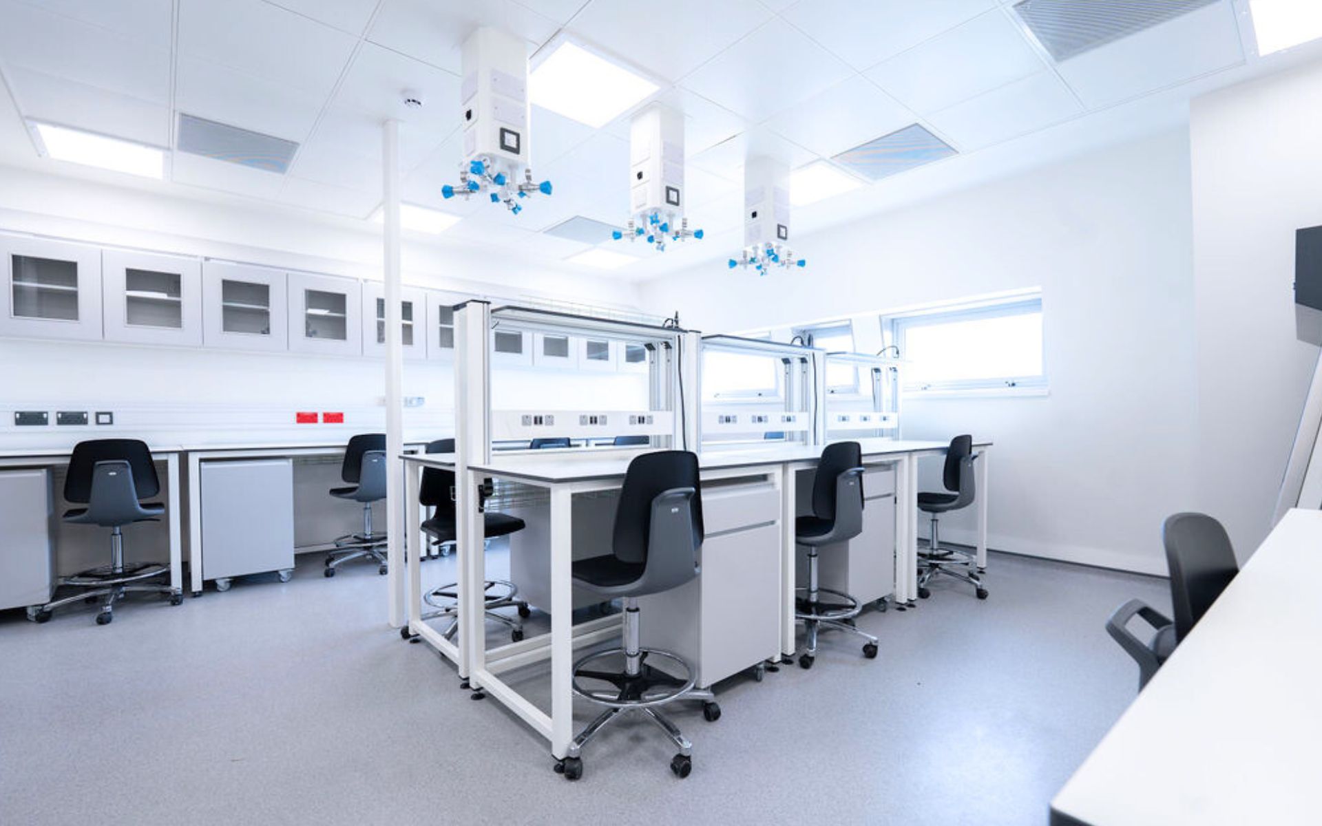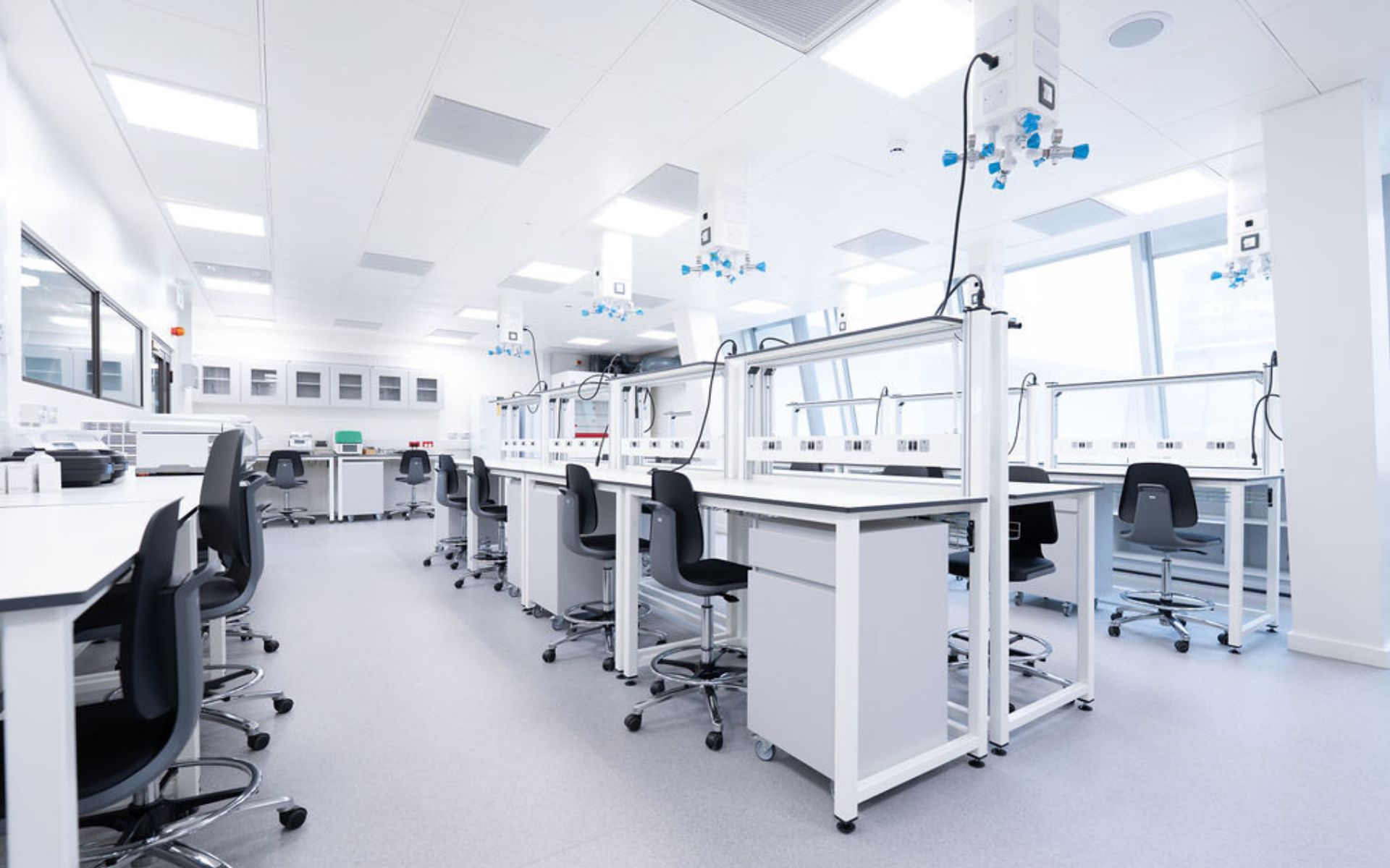 • Essential lab infrastructure – Piped gases (compressed air, oxygen, nitrogen, CO₂), under-bench storage, co-working write-up spaces, breakout areas, biosafety cabinets, fume hoods
